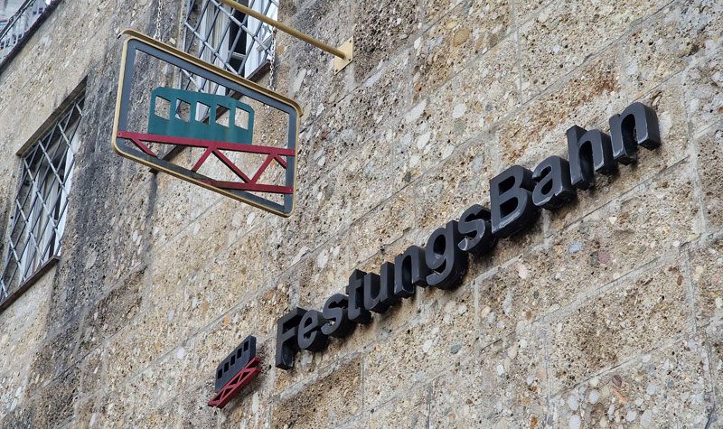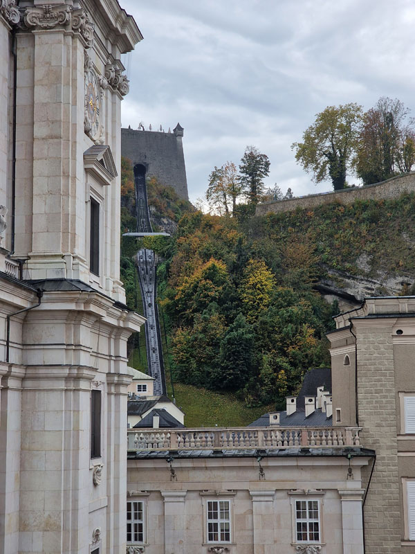 ved fæstningsværket, Hohensalzburg, hvis historie kan føres helt