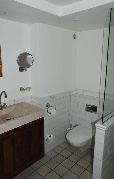 kunstnernavne. Th.: Moderne, åbne toiletforhold. Halvkøligt,